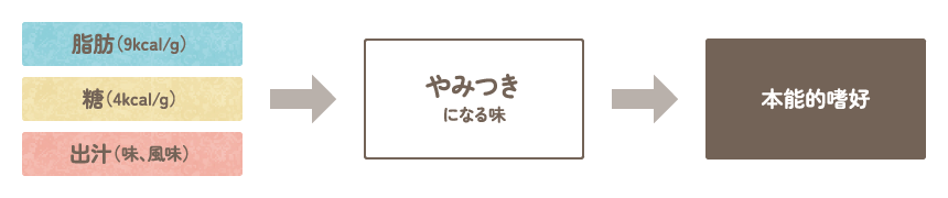 やみつきになる味を構成するものとして、脂肪、糖、だしがあります。食の欧米化が進む中で、脂肪と糖の過剰摂取により生活習慣病になるリスクが増えています。そんな中で生活習慣病を未然に防ぐ方法として、出汁の効いた料理を食べることが重要とされています。しかしながら、大人になった後に出汁に立ち戻ろうとしても、離乳完了期までにその子が出汁の風味や旨味を感じていなければ帰る場所がなくなってしまいます。 ウエルビーフードシステムでは、離乳期の食事から出汁に注目して給食提供を行い、生活習慣病を未然に防ぐという考え方から、そもそも生活習慣にならない(ウエルビーイング)食経験の基礎を園児様に提供していきます。